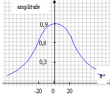 diffraction des ultrasons : Un émetteur émet en continu des ultrasons de fréquence f= 40 kHz. A 15 cm de ce dernier, un récepteur placé dans une gouttière en forme d'arc de cercle reçoit ces ondes. Ce récepteur est relié à un oscilloscope ( sensibilité étant 5 ms / div).On relève l'amplitude de l'onde reçue en fonction de l'angle q que fait l'axe de symétrie du système avec la droite joignant l'émetteur au récepteur.(figure (1) ![]() On obtient les valeurs suivantes :