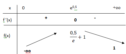 f '(x) = 0 si ln(x) =0,5 ; x = e