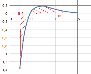 La surface hachurée limitée par le graphe de f, l'axe des abscisses et les droites d'équations x = 0,2 et x =m est égale à I