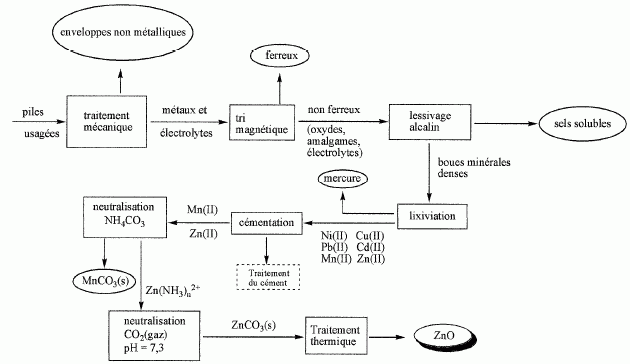 Quelques aspects d'un procédé de valorisation des piles usagées. Les principales étapes d'un procédé de traitement des piles usagées par la société française RECUPYL SA sont les suivantes :