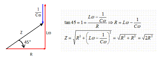 Soit un circuit composé d’une résistance R, d’une inductance L et d’un condensateur de capacité C montés en série. Lorsqu’on applique au circuit une tension v = 240 sin (314 t) , il est traversé par un courant i = 10 sin (314 t – pi/4 ) . On donne L = 60 mH. Calculer l’impédance Z du circuit. Z = Umax / Imax = 240/10 = 24 W. Calculer R et C. L'intensité est en retard de pi/4 sur la tension : le dipôle est donc inductif. ![]() 2R2 = Z2 ; R = 0,5½ Z = 0,7071*24 =16,97 ~ 17 W.