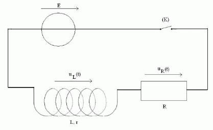 ![]() Dans le circuit électrique représenté ci-dessus la bobine est caractérisée par son inductance L et sa résistance r, le générateur délivre une tension constante E, le conducteur ohmique est caractérisé par sa résistance R. A t = 0 s on ferme l’interrupteur (K). On note uR(t) la tension aux bornes du conducteur ohmique, uL(t)la tension aux bornes de la bobine et i(t) le courant circulant dans le circuit.