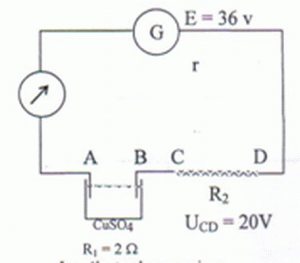 Fcem de l'électrolyseur à électrodes de cuivre identiques E' = 0 V. Intensité du courant : I = E/ ( R2+R+r) = 6 / (2+2,2+0,8) =1,2 A.