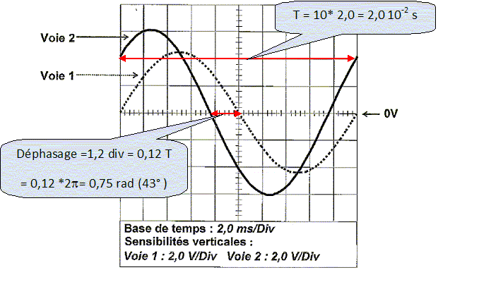 Déterminer la période T, la fréquence f et la pulsation w. ![]() f = 1/T = 1/0,020 = 50 Hz ; w = 2pf = 6,28*50 = 314 ~3,1 102 rad/s. Quelle est la grandeur visualiser sur la voie 1 ? Sur la voie 2 ? On visualise uR sur la voie 1. On visualise u(t) = uR+uL sur la voie 2, soit la tension aux bornes du générateur. Quelle courbe permet d'avoir l'image de i(t) ? Justifier. La tension aux bornes du conducteur ohmique est proportionnelle à l'intensité du courant qui le traverse. UR(t) est l'image de l'intensité au facteur R près. Déterminer en précisant son signe, le déphasage f de la tension u(t) par rapport à i(t). Lorsque les deux courbes sont croissantes, la première qui passe par un maximum est en avance sur l'autre ; u(t) est en avance sur i(t).
