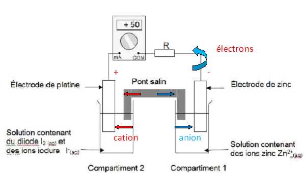 Donner l’expression du quotient de réaction initial Qri et calculer sa valeur. Qri = [I-(aq)]02 [Zn2+(aq)]0 / [I2(aq)]0 =(5,0 × 10-2)2*1,0 × 10-1 / 1,0 × 10-1 = 2,5 10-3. La constante d’équilibre associée à l’équation de la réaction ayant pourréactifs le zinc métal et le diiode en solution aqueuse est K = 1046 à la température T = 25 °C. Prévoir le sens d’évolution spontanée du système chimique constituant la pile. Qri < K, donc évolution spontanée dans le sens direct. Que peut-on dire de l’évolution de la concentration molaire en diiode dans le compartiment 2 lorsque la pile fonctionne ? Justifier à partir de l’expression du quotient de réaction Qr. Lors du fonctionnement de la pile Qr tend vers K : Qr augmente fortement. Qr = [I-(aq)]2 [Zn2+(aq)] / [I2(aq)]. [I-(aq)], [Zn2+(aq)] augmente, [I2(aq)], un réactif, diminue.