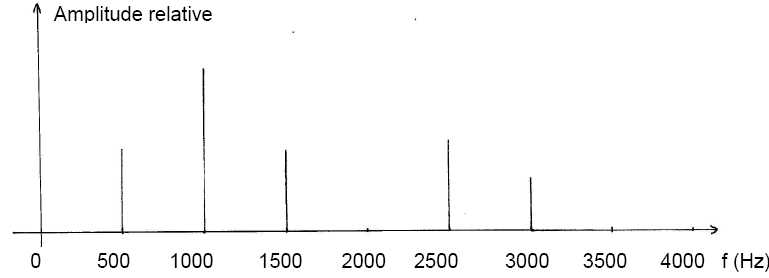 Analyse et synthèse des sons. On a mesuré la fréquence f1 d’une note émise par le violon : f1 = 220 Hz. Parmi les fréquences suivantes, indiquer les fréquences qui correspondent à des « harmoniques» de la note émise par le violon : f2 = 110 Hz ; f3 = 330 Hz ; f4 = 440 Hz ; f6 = 660 Hz. Les fréquences des harmoniques sont multiples de la fréquence du fondamental : f4 = 440 Hz ; f6 = 660 Hz. L’analyse spectrale d’une autre note émise par le violon donne le spectre du document 4. Quelle est la fréquence du fondamental ? 500 Hz. Quelles sont les fréquences des harmoniques présentes dans ce spectre ? f2 = 1000 Hz ; f3 = 1500 Hz ; f5 = 2500 Hz et f6 = 3000 Hz. Pour