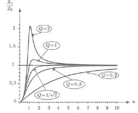 Q : facteur de qualité de l'oscillateur ( sans dimension ) ; w0 : pulsation propre ( rad/s) : T-1. On cherche la réponse du sismographe sous la forme : x(t) = X0 cos ( wt+F). On pose u = w / w0. Montrer que :  En notation complexe : x(t) =X0 exp (j F) ; x'(t) = jwX0 exp (j F) ; x"(t) = (jw)2X0 exp (j F)= -w2X0 exp (j F). Repport dans (2). -w2X0 exp (j F) + w0 /Q jwX0 exp (j F) + w02 X0 exp (j F) = w2Z0. Diviser par w02 : (-w2/ w02 +j w /(Qw0) +1) X0 exp (j F)= w2/ w02Z0. (1-u2 + j u / Q) X0 exp (j F) = u2Z0. Identifier les modules : ((1-u2)2 + u2/Q2)½ X0 = u2Z0 ; X0 /Z0 = u2/ ((1-u2)2 + u2/Q2)½. Le graphe représentant X0 /Z0 en fonction de u, pour différentes valeurs du paramètre Q est donné :