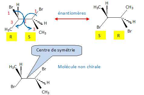 La carvone peutexister sous deux configurations différentes. Comment appelle -t-o ces deux stéréoisomères A et B ? ![]() A et B sont deux énantiomères. ![]() Quelle relation y-at-il entre A et C ? Entre B et C ? A et C sont deux énantiomères. B et C sont identiques. Dessiner le 2,3-dibromobutane. Dessiner tous les stéréoisomères de cette molécule. Identifier le ou les couples d'énantiomères. ![]()