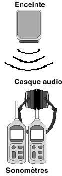 deux réglables.Le capteur d’un premier sonomètre est placé entre les deux oreillettes du casque. Les oreillettes sont en outre maintenues plaquées l’une contre l’autre de manière à enfermer le mieux possible le capteur. Ce sonomètre mesure ainsi le niveau d’intensité sonore L entre les oreillettes. Casque et sonomètre sont placés face à l’enceinte.