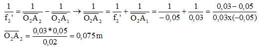 Étude optique au niveau de l’objectif. Déterminer la distance focale f1’de la lentille L1. f1' = 1/C1 = 1/5,00 = 0,200 m = 20,0 cm. Où se forme l’image A1B1 ? l'image d'un objet situé àl'infini se forme dans le plan focal image de la lentille L1. Quelle est la taille de cette image A1B1 ? La graduation de hauteur 1 cm =0,01 m située à une distance d = 45 m est vue sous l'angle a =0,01/45 =2,22 10-4 rad. La taille de l'image A1B1 est égale à a f1' =2,22 10-4*0,20 = 4,44 10-5 m. La lentille L2 est située 17,0 cm après la lentille L1. Sur l’axe optique, quelle est la valeur de la distance algébrique O2A1 ? A1 est situé à droite de O2 : O1A1-O1O2 = 20,0-17,0 = 3,00 cm. En déduire la valeur de la distance algébrique O2A2.