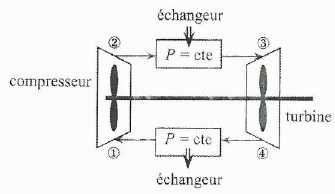 Le cycle est constitué de deux isobares et de 2 isentropes ( ou nadiabatiques réversibles ). - compression adiabatique réversible dans le compresseur du point 1 ( T1=300K ; P1=20 bar ) vers le point 2 ( P2 = 80 bar ) ; - détente isobare dans l'échangeur du point 2 vers le point 3 ( T3=1,30 103 K) ; - détente adiabatique réversible dans la turbine de 3 vers 4 ( de P3=P2 à P4=P1 ) ; - compression isobare dans l'échangeur de 4 vers 1. On donne pour l'hélium Cvm = 1,5 R et Cpm = 2,5 R. Pour une transformation isentropique PVg = K = constante.