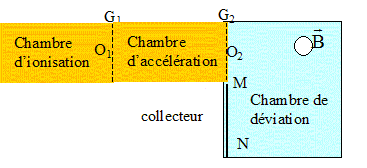 Dans la chambre d'ionisation les atomes d'uranium 23592U et 23892U de masses respectives m 1 et m 2 portés à haute température sont ionisés en ion U +. A la sortie de cette chambre, la vitesse des ions est quasi-nulle. Les ions sont accélérés entre O 1 et O 2 sous l'action d'une différence de potentiel établie entre les grilles G 1 et G 2. Les ions sont ensuite déviés par un champ magnétique uniforme. Une fente centrée sur O 2 de largeur L dans le plan de la figure permet de choisir la largeur du faisceau incident. Une fente collectrice est placée entre M et N et a pour largeur L 0 dans le plan de la figure. Les chambres sont sous vide. On négligera le poids des ions devant les autres forces. Quel doit être le signe de la tension VG1-VG2 pour que les ions soient accélérés entre O1 et O2 ? th. de l'énergie