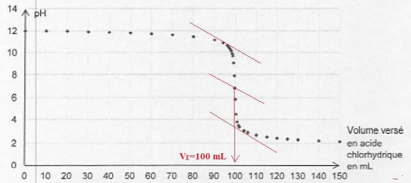 erlenmeyers 1 et 2 sont rassemblés. On obtient la solution S1. Un test au papier pH permet d'estimer que la valeur du pH est d'environ 12. Un titrage permet de déterminer la quantité d'ion hydroxyde restant dans la solution S1. On trouve n(HO-) = 7,2 mmol.