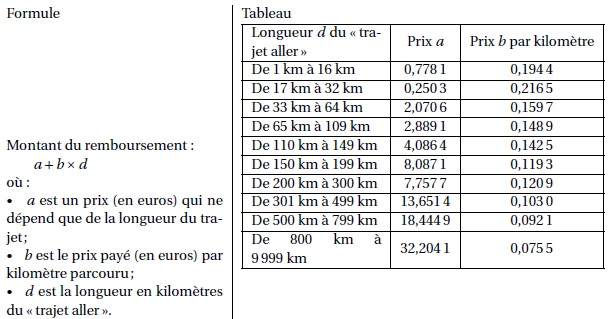 1. Pour un « trajet aller » de 30 km, vérifier que le montant du remboursement est environ 6,75 €.