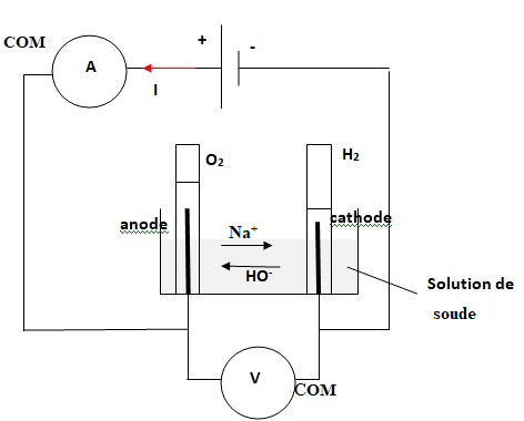 Oxydation de l'eau en dioxygène à l'anode positive.