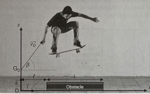 du skateboardeur a pour coordonnées z0 = 0,80 m et x0 = 0 et sa vitesse est v0. L'action de l'air est négligeable.