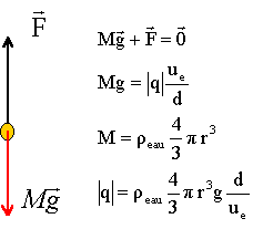 |q|=103*4/3*3,14 * (5,4 10-6)3 *9,8 *0,1 / 103= 6,4 10-16 C. la force électrique et le champ électrique sont colinéaires et de sens contraire ( charge q négative) Le champ électrique pointe vers le bas, vers le plus petit potentiel: donc l'armature inférieure porte une charge négative.