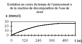 xf =V(O2)oo / Vm =0,295/22,4 =0,0132 mol C1V1 -2xf =0 ; C1V1 =2xf ; C1=2xf / V1= 2V(O2)oo / (VmV1)= 2*0,0132 / 0,1 = 0,263 mol/L C0 = 5*0,263 = 1,31 mol/L vitesse volumique de la réaction v=1/V1 dnO2/dt = dx/dt la vitesse volumique diminue au cours du temps car la concentration du réactif diminue : la valeur de cette vitesse est donnée par la pente de la tangente à la courbe x=f(t) ; elle est maximale au départ et nulle au bout d'un temps supérieur à 500 s ( tangente horizontale)