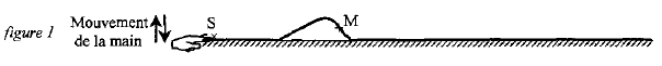Une très longue corde élastique inextensible est disposé horizontalement sur le sol. Un opérateur crée une perturbation en imprimant une brève secousse verticale à l'extrémité S de la corde. ![]()