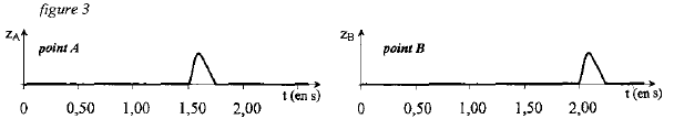 La figure 5 indique que : Données : les cordes ont même masse linéique, mais n'ont pas la même tension. le front de l'onde de l'expérience 2a arrive au point K à l'instant ta = 1,50 s . le front de l'onde de l'expérience 2b arrive au point K à l'instant tb = 0,80 s . Le front de l'onde atteint le point K plus rapidement dans l'expérience 2b que dans l'expérience 2a ; donc a célérité de l'onde est plus grande dans l'expérience 2b que dans l'expérience 2a. la tension de la corde modifie donc la célérité de l'onde. De plus, la tension de la corde est plus grande dans l'expérience 2b que dans l'expérience 2a. La célérité de l'onde est d'autant plus grande que la tension de la corde est plus grande. La figure 6 indique que : Données : les cordes sont différentes (masse linéique différente), mais ont la même tension. le front de l'onde de l'expérience 3a arrive au point K à l'instant ta = 1,00 s . le front de l'onde de l'expérience 3b arrive au point K à l'instant de date tb = 1,50 s . Le front de l'onde atteint le point K plus rapidement dans l'expérience 3a que dans l'expérience 3b. La célérité de l'onde est donc plus grande dans l'expérience 3a que dans l'expérience 3b. La masse linéique de la corde modifie donc la célérité de l'onde. De plus, la masse linéique de la corde est plus faible dans l'expérience 3a que dans l'expérience 3b. La célérité de l'onde est d'autant plus petite que la tension de la corde est plus grande.
