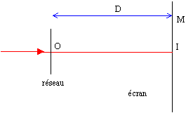 corrigé interférences constructives : les amplitudes des ondes qui interfèrent s'ajoutent ; l'amplitude résultante est maximale. Dans la région où se superposent les ondes, l'intensité lumineuse passe par des maximums et des minimums qui peuvent être nuls. Les maximums dépassent la somme des intensités des faisceaux pris séparément. La zone d'ordre p=0 se trouve en I ( d'après sin q= pl/a , si p=0 alors q =0) Un laser émet une lumière quasiment monochromatique. tan q = IM / D= 0,145 / 1,4 =0,1036 sin q =0,1036 =l/a avec a = 6,1 10-6 m l