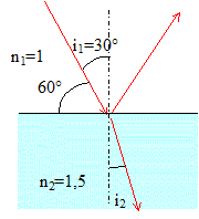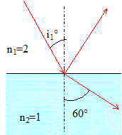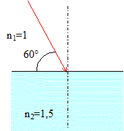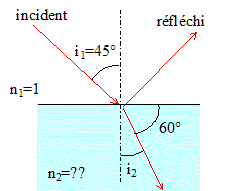1. Calculer l'indice n2.loi de Descartes : n1 sin i1 = n2 sin i2l'angle i2, formé entre la normale et le rayon réfracté, est égal à : °n2 = n1 sin i1 / sin i2 = sin 45 / sin 30 = .2. Compléter la figure et calculer i2, angle de réfraction.l'angle i1, formé entre la normale et le rayon incident, est égal à ° loi de Descartes : n1 sin i1 = n2 sin i2sin i2 = n1 sin i2 / n2 = sin 30 / 1,5 ; i2 = °3. Compléter la figure et calculer i1, angle d'incidence.loi de Descartes : n1 sin i1 = n2 sin i2sin i1 = n2 sin i2 / n1 = sin 60 / 2 ; i1 =°le milieu 1 est plus , l'angle i1 est plus petit que l'angle i2.4.Compléter la figure. Nommer le phénomène observer.Le milieu 1 est plus réfringent que le milieu 2: le rayon réfracté n'existe pas toujours.Calcul de l'angle d'incidence limite au dela duquel le rayon réfracté n'existe plus : i1 (limite) = sin-1 ( n1/n2) = sin-1(1/2) = 30°Or i1 > i1(limite), il y a .