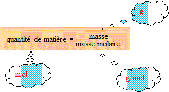Un flacon contient un litre de solution de chlorure d'hydrogène et porte les indications suivantes : densité d=1,05 ; pourcentage massique en chlorure d'hydrogène HCl : 10 %. On donne : H : 1 ; Cl : 35,5 g/mol.1. Quelle est la masse de un litre de solution ? La masse de 1 L de solution est : 1,05 kg = g.2. Quelle est la masse de chlorure d'hydrogène ayant servi à préparer la solution ? Le chlorure d'hydrogène représente 10 % de la masse de la solution soit 0,1*1050 = g.3. Quelle est la concentration molaire en soluté apporté ? masse molaire HCl : 1 +35,5 = 36,5 g/molQté de matière : / = mol.Volume de la solution : 1Lconcentration molaire en soluté apporté : 2,9 .4. Quel volume de chlorure d'hydrogène HCl(g); à 20°C et à pression normale, at-il fallu dissoudre dans l'eau pour préparer la solution ? Volume molaire = 24 L/mol.volume = 24*105/36,5 = L