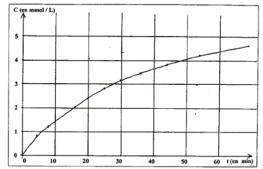 vitesse molaire volumique de formation du diode à la date t= 20 min : coefficient directeur de la tangente à la courbe à la date considérée.