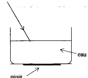 angle de réfraction du rayon pénétrant dans l'eau : n1 sin i1 = n2 sin i2 ; sin i2 = n1 sin i1/ n2 =sin 30 / 1,33 =0,376 ; i1 = 22°.