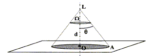 Sa puissance électrique est de 40 W. Elle est munie d'un réflecteur qui permet d'éclairer un plan (P) situé à une distance OL=d=1,50 m. L'efficacité lumineuse du système est k = 25 lm W-1. La lampe émet uniformément, dans toutes les directions, à l'intérieur d'un faisceau conique de sommet L, d'axe de révolution OL et de demi-angle au sommet q=45°. Le faisceau occupe alors l'anhle solide W= 2p(1-cosq).