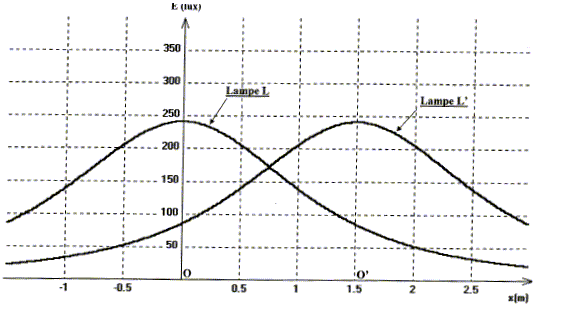 La distance OO' est fixée à 1,50 m. On pose x=valeur algébrique de OM. On donne les courbes E(x) de variation de l'éclairement des deux lampes :