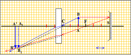 AB : objet ; A1B1: image intermédiaire donnée par le miroir sphérique ; A'B' : image définitive. sens positif : celui de la lumière incidente ( le sens change après réflexion sur le miroir) Relation de conjugaison pour le miroir avec origine au sommet : 1/ SA1 -1/ SA = -2/SC ; 1/ SA1 = -2/SC +1/ SA avec SA = -0,4 m , SC = -0,6 m 1/ SA1 =2/0,6 + 1/(-0,4) =3,333-2,5 = 0,833. SA1 =1,2 m. A1B1 joue le rôle d'objet pour la lame à faces parallèles. Le déplacement de l'image A' par rapport à l'objet A1 a pour expression : AA1 = e( 1-1/n) = 0,09(1-1/1,5) =0,03 m