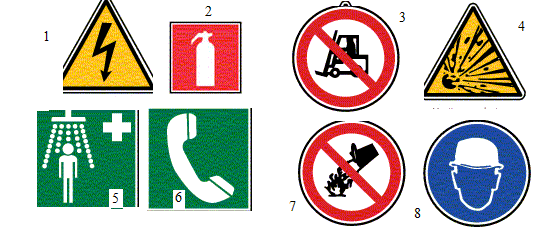 1 : danger électrique ; 2 : extincteur ; 3 : interdit aux véhicules de manutention ; 4 : risque d'explosion 5 : douche de sécurité ; 6 : téléphone pour premiers secours ; 7 : défense d'éteindre avec de l'eau ; 8 : port du casque obligatoire.