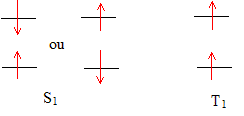 Deux états excités sont accessibles à ces électrons ( S1 : état singulet de spin total nul et T1 : état triplet de spin égal à 1 de plus basse énergie)