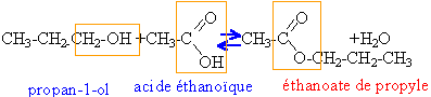 à reflux. Equation de la réaction d’estérification dans le cas de la réaction entre le propan-1-ol et l’acide éthanoïque (ou acide acétique).
