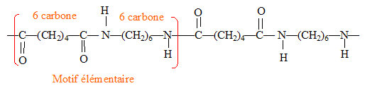 HOOC-(CH2)4-COOH et d’une diamine de formule H2N-(CH2)6-NH2. ( avec élimination de H2O) Représentation d'un fragment de structure du nylon 6-6 en identifiant le motif élémentaire de la chaîne :
