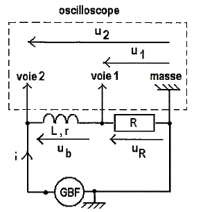 On réalise le circuit ci-dessous comprenant en série : un générateur basse fréquence( GBF), la bobine de résistance r et d'inductance L et un conducteur ohmique de résistance R= 200 ohms.