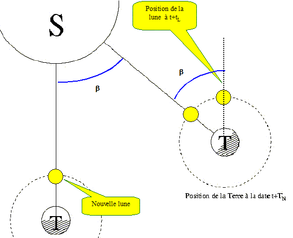 En 27,3 jours, la terre décrit autour du soleil un angle b= 2p *27,3/365 =0,47 rad. La lune se retrouve à la position " nouvelle lune" lorsqu'elle a parcouru sur son orite un angle de 2p+0,47 = 6,75 rad. Ce qui correspond à : 6,75/0,23 = 29,4 jours.