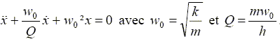 d2x/dt2 + h/m dx/dt + k/m x = 0 On pose w02 = k/m ; Q= mw0/h soit h/m = w0/Q. d'où : d2x/dt2 + w0/Q dx/dt +w02 x =0. (1) On se place dans le cas du régime pseudo-périodique. Les solutions sont de la forme :