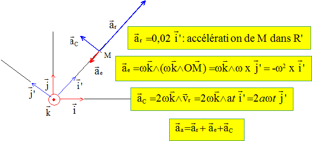 Calculer la norme et la direction du vecteur accéleration absolue du point M. ar= 0,02 m s-2 ; ae= -w2x avec x = ½at2 ; ae= -½w2 at2 ; aC=2war t ; aa = [(ar-ae)2 + aC2]½ =[(0,02-½w2 at2 )2 +(2war t)2]½. Dessiner ces 3vecteurs à la date t=2 s. ar= 0,02 m s-2 ; ae= -½w2 at2 = -1,6 10-5 m s-2 ; aC=1,6 10-3 m s-2.