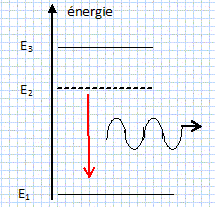 Décrire le phénomène d'émission stimulée entre le niveau E2 et E1. Quels sont les caractéristiques du photon émis ? On peut aussi favoriser la désexcitation d’un électron en envoyant sur l’atome excité une lumière ( onde électromagnétique) dont la longueur d’onde correspondant à l’énergie de transition entre les deux états électroniques. On appelle ce phénomène l’émission stimulée (ou émission induite). Il y a amplification si les atomes sont plus nombreux à être dans l'état n' ( atome excité susceptible d'émettre) que dans l'état n (susceptible d'absorber) : il est nécessaire d'avoir une « inversion de population ». L’émission stimulée d’un atome ou d’une molécule donne un nouveau photon qui a exactement les mêmes fréquence, phase et direction que le photon incident ; dans un laser, cela se fait sur un très grand nombre d’atomes ou molécules identiques. Un laser émet une onde lumineuse intense dont la direction, la fréquence et la phase sont très bien déterminées. ( lumière cohérente).