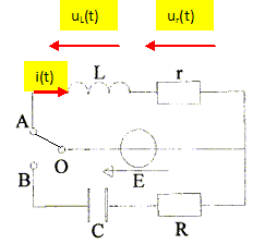 Le générateur est une source idéale de tension de fem E = 6,0 V. A t = 0 on relie les points O et A. Représenter le circuit parcouru par le courant i(t), et noter les tensions uL(t) aux bornes de l'inductance L et ur(t) aux bornes de la résistance r.