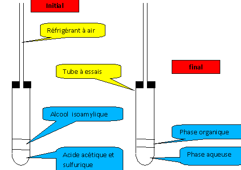 réagit violemment avec l'eau. Les vapeurs se condensent dans le réfrigérant à air et tombent à l'état liquide dans le tube à essais. L'alcool isoamylique et l'acide acétique sont des liquides non miscibles. Le liquide le plus dense, les acides, ocuppe la partie inférieure. Après transformation chimique, la substance odorante ( phase organique) et la phase aqueuse ne sont pas miscibles. Le liquide le plus dense, la phase aqueuse, ocuppe la partie inférieure.