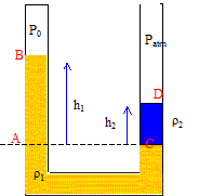 Expression de la pression au point A ( branche de gauche) : PA=P0+ r1gh1. Expression de la pression au point C ( branche de droite) : PC=Patm+ r2gh2. PA=PC d'où : P0+ r1gh1 =Patm+ r2gh2 ; r1gh1 = Patm- P0+ r2gh2 ; h1 = (Patm- P0)/ (r1g ) +r2 /r1h2 ; h1 =11600/(10 000) + 13,6*0,1 =2,52 m. |