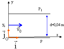 L'exercice a pour but de comparer le mouvement d'une particule chargée traversant un champ électrique et le mouvement d'un projectile lancé horizontalement dans le champ de pesanteur terrestre. Données : masse de l'électron m = 9,110-31 kg ; charge de l'électron q = - e = - 1,6.10-19 C ; champ de pesanteur g = 9,81 m .s -2 Déviation d'un faisceau d'électrons dans un champ électrique uniforme : Le champ électrique est créé par un condensateur plan constitué de deux plaques parallèles et horizontales (P l et P2) reliées à un générateur de tension constante U=205 V et séparées d'une distance d, comme l'indique la figure ci-dessous. ![]() Tous les électrons pénètrent dans le champ, supposé uniforme, à l'ordonnée y0 et sont animés de la même vitesse parallèle aux plaques.