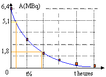 émision d'électrons et de rayons gamma. conservation de la charge : 53 = -1 + Z d'où Z= 54 conservation du nombre de nucléons : 131 = 0 +A d'où A = 131 X est un isotope du xénon énergie libérée par désintégration : |perte de masse| = 130,877 05-(130,875 45+5,485 10-4) = 1,051 10-3 u énergie libérée: 1,051 10-3* 931,5 = 0,978 MeV. activité : A = A0 exp ( - lt) = A0 exp ( - t / t ) l : constante radioactive telle que l t½ = ln2 t½ = 8 jours ; l = ln(2) / 8 = 0,0866 jour-1; t = 1/l= 11,541 jours. activité à t = 1