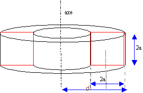 On considère un bobinage de N spires réguliérement réparties sur un tore à section carrée, sans noyau de fer, dont les caractéristiques sont les suivantes : N=200 ; coté du carré 2a=5 cm; distance du centre de l'un des carrés à l'axe du tore d=6 cm.