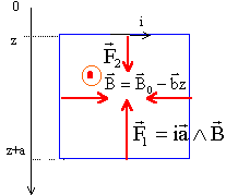 norme de F1 : ia(B0-b(a+z)) norme de F2 : ia(B0-bz) norme de la résultante des forces : F = ia²b fem dinduction et courant induit : e = - dF/dt = a²b dz/dt = a²b v avec v= dz/dt = z'. intensité du courant : i = e/R = a²b/R v. résultante des forces électromagnétiques : F =a4b2/R v.