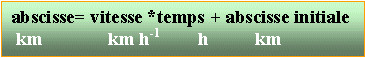 La distance séparant A et B à la date t=0 est 172-27 = 145 km. Lors du croisement les abscisses de A et B sont identiques 108 t + 27 = -126 t +172 t =( 172-27) / (108+126) = 0,619 h ou 31 min 11 s abscisse du croisement : remplacer le temps par la valeur précédente dans l'une ou l'autre espression de l'abscisse. 108*0,619 +27 = 93,85 km distance parcourues : par A : 93,85-27 = 66,85 km par B : 172-93,85 = 78 ,15 km