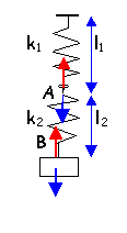 T1=T2= k1(l1-l0) =k2(l2-l'0) en B : Mg= k2(l2-l'0) l'allongement du système est DL= ( l1+ l2) -(l0 + l'0) DL =( l2- l'0) + ( l1- l0) =( l2+ l'0) +k2 /k1(l2-l'0) DL =( l2- l'0)[ 1+k2 /k1] Mg= k2 / [ 1+k2 /k1] DL raideur du ressort unique : k2 / [ 1+k2 /k1]=k1k2 / ( k1+ k2) longueur à vide de ce ressort : l0 + l'0 si les deux ressorts sont identiques : 0,5 k et 2lo |